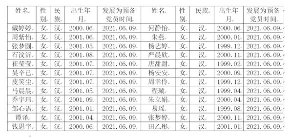 经本人申请,党支部教育、培养和考察,学院党委研究同意,对预备期已满,拟转正的预备党员人选进行公示。对公示人选有不同意见者,请于2022年6月15日前,当面或署名书信、电话向学院党委反映。