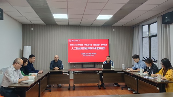 马院网10月16日电(记者 李玉才)2025年10月15日,由淮阴师范学院教务处主办,马克思主义学院承办的2025-2026学年第一学期分片区“师说新语”教学研讨活动,在马克思主义学院501会议室顺利举行。本次活动以“人工智能时代教师数字化素养提升”为主题,商学院杨松副教授、马克思主义学院唐艳群副教授主讲,马克思主义学院新进教师参与研讨。