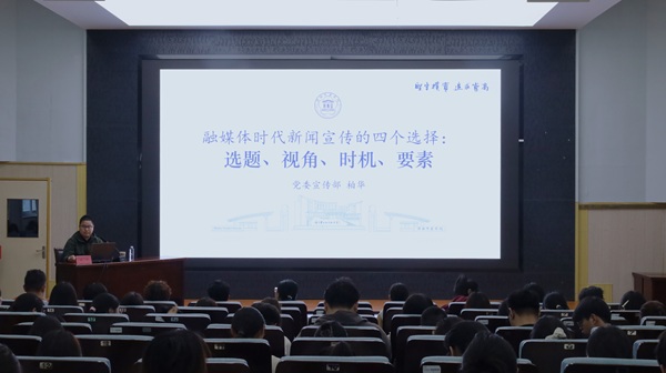 马院网4月17日电(记者 张瑞涵 郝淑祯)4月17日下午,马克思主义学院在交通路校区图书馆逸夫报告厅举办新闻宣传工作专题培训会。本次培训特邀校党委宣传部副部长柏华主讲,学院党委副书记严凤莲主持主持会议,2024级、2025级全体学生参会学习。
