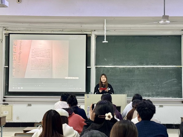 活动现场,各宣讲小组紧扣主题,从不同维度展开生动分享。戴苏同小组聚焦抗战英雄群像,通过讲述杨靖宇、赵一曼等抗战英雄事迹,生动还原了革命先烈为民族解放挺身而出的英雄气概;沙铭玮小组以淮安新安旅行团为独特切入点,结合淮安地区作为抗战敌后根据地的历史背景,展现了地方儿女与全国人民同仇敌忾、共赴国难的家国情怀;朱桐小组创新宣讲形式,通过剪辑的抗战历史纪录片片段,将平型关大捷、百团大战等关键战役的壮阔场景与细节故事相结合,沉浸式的呈现方式让现场观众仿佛重回那段艰苦卓绝又热血沸腾的岁月,引发强烈情感共鸣。